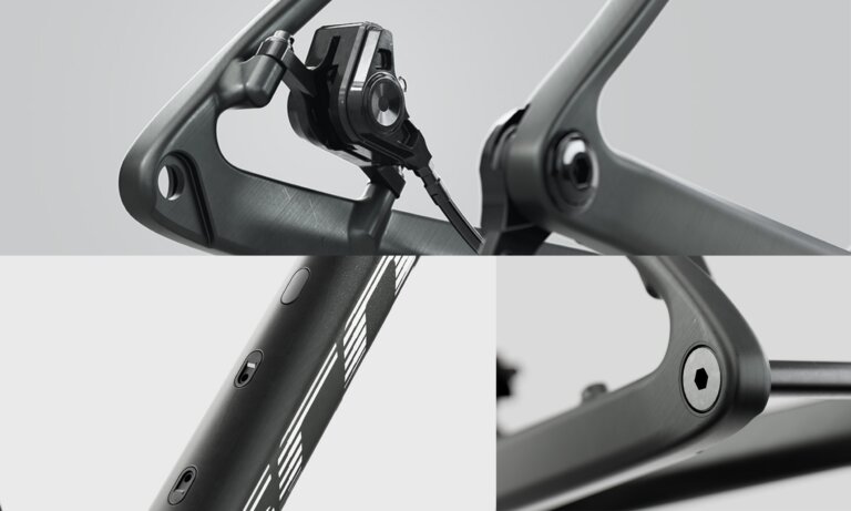 Okvir je na voljo v karbonski ali aluminijasti izvedbi, pri čemer obe različici sledita enaki geometrijski filozofiji. Karbonska verzija prinaša nižjo težo in bolj neposreden občutek pri pospeševanju. Aluminijasta izvedba ponuja robustnost, predvidljivo odzivnost in visoko stopnjo vzdržljivosti. Ne glede na material okvirja je poudarek na uravnoteženem razmerju med togostjo in udobjem.